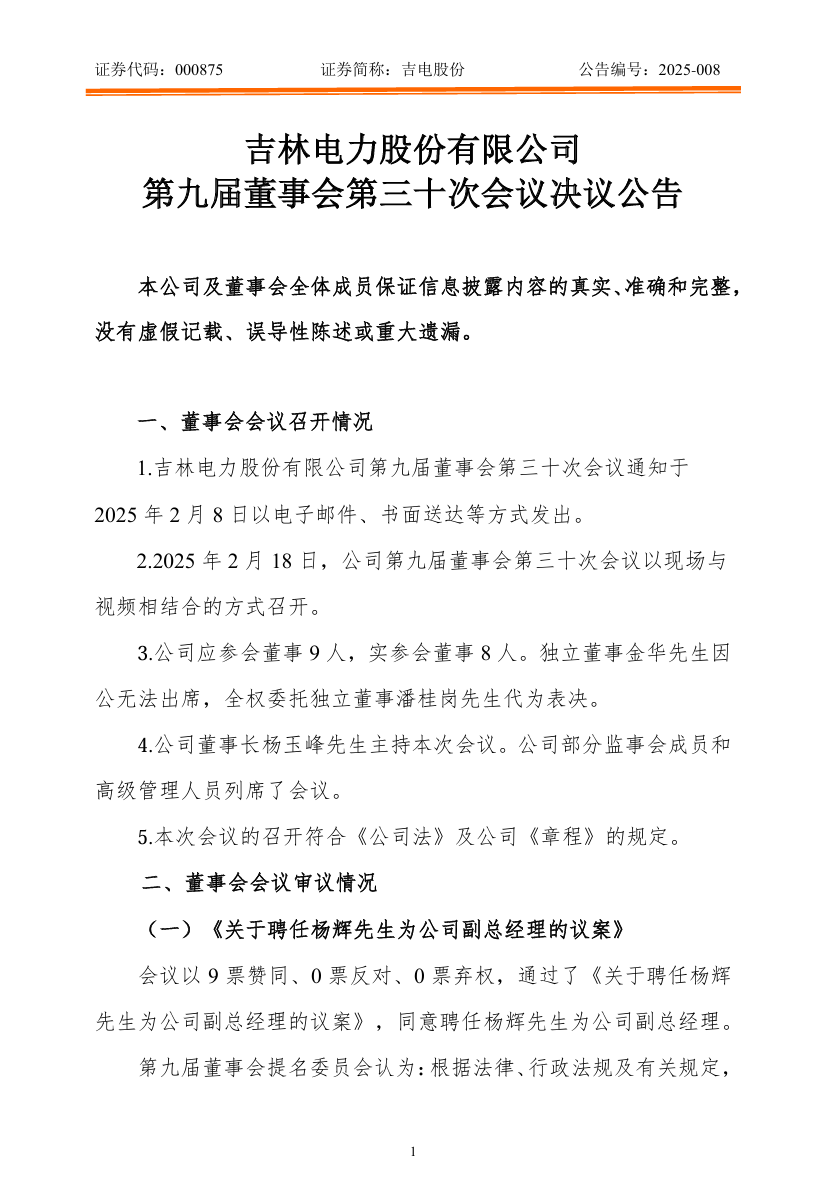 2月18日,吉電股份發(fā)布公告稱,公司第九屆董事會(huì)第三十次會(huì)議審議通過(guò)了《關(guān)于聘任楊輝先生為公司副總經(jīng)理的議案》,同意聘任楊輝先生為公司副總經(jīng)理。