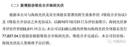 根據(jù)報告書,原海潤光伏2008年、2009年和2010年1~10月實(shí)現(xiàn)的凈利潤分別為2.11億、0.26億(據(jù)說是受金融危機(jī)影響)、2.7億,妥妥的優(yōu)質(zhì)資產(chǎn)。