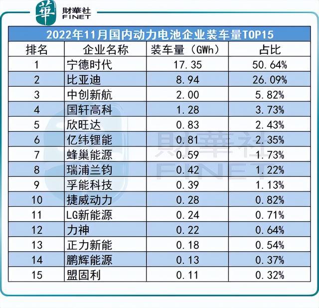 寧德時(shí)代(300750.SZ)在2022年1-11月動力電池的累計(jì)裝機(jī)量124GWh,國內(nèi)市占率48.02%,比位居第二的比亞迪23.11%的市占率、第三的中創(chuàng)新航6.73%的市占率要高出不少。