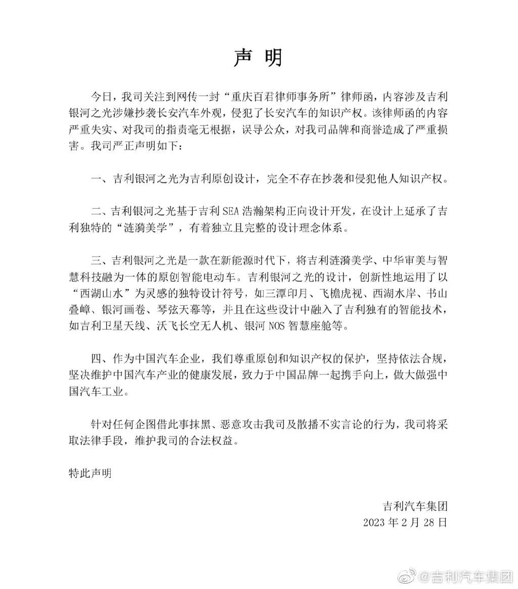 針對(duì)抄襲傳聞,吉利汽車(chē)直斥上述律師函“內(nèi)容嚴(yán)重失實(shí)、指責(zé)毫無(wú)根據(jù),誤導(dǎo)公眾,對(duì)我司品牌和商譽(yù)造成了嚴(yán)重?fù)p害。”根據(jù)吉利汽車(chē)2月28日發(fā)布的聲明,吉利銀河之光為吉利原創(chuàng)設(shè)計(jì),完全不存在抄襲和侵犯他人知識(shí)產(chǎn)權(quán)。