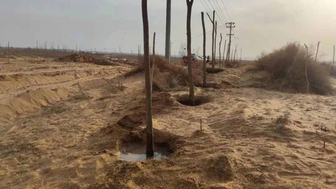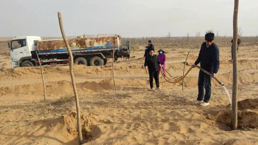 (靈武市自然資源局專業(yè)技術(shù)人員指導苗木保護,馬家灘鎮(zhèn)工作人員對苗木進行澆灌)