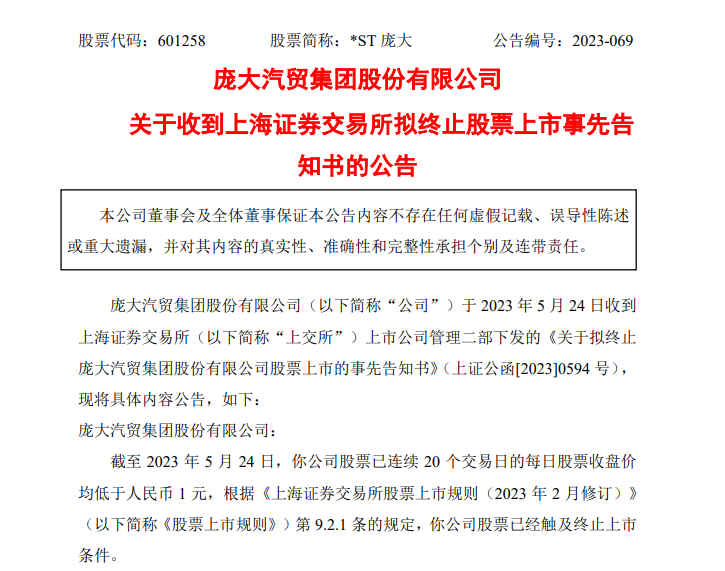 5月24日晚間,*ST龐大(601258.SH)發(fā)布公告稱,龐大汽貿集團股份有限公司(以下簡稱龐大集團)于5月24日收到上海證券交易所(以下簡稱上交所)上市公司管理二部下發(fā)的《關于擬終止龐大汽貿集團股份有限公司股票上市的事先告知書》(以下簡稱《告知書》)。