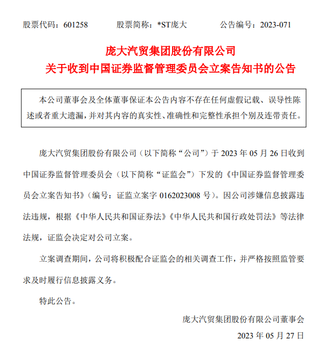 5月26日,*ST龐大再發(fā)公告稱,公司于5月26日收到中國證券監(jiān)督管理委員會(以下簡稱證監(jiān)會)下發(fā)的《中國證券監(jiān)督管理委員會立案告知書》。因公司涉嫌信息披露違法違規(guī),根據(jù)相關法律法規(guī),證監(jiān)會決定對公司立案。立案調查期間,公司將積極配合證監(jiān)會的相關調查工作,并嚴格按照監(jiān)管要求及時履行信息披露義務。