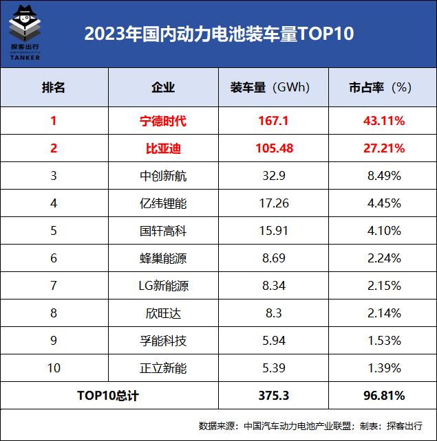 「探客出行」從中國(guó)汽車動(dòng)力電池產(chǎn)業(yè)聯(lián)盟獲悉,2023年國(guó)內(nèi)動(dòng)力電池裝車量TOP10企業(yè)累計(jì)裝車量約375.3GWh,占據(jù)國(guó)內(nèi)動(dòng)力電池總裝機(jī)量的96.81%。其中寧德時(shí)代,比亞迪以絕對(duì)優(yōu)勢(shì)穩(wěn)居前二,累計(jì)市場(chǎng)占有率超七成。