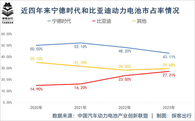 雖說,寧德時(shí)代在2023年國(guó)內(nèi)動(dòng)力電池市場(chǎng)的市占率位居全行業(yè)第一,高達(dá)43.11%,但相比于2021年高達(dá)52.10%的市占率,已經(jīng)出現(xiàn)了明顯下滑。