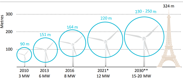 2019年,國(guó)際能源署發(fā)布《2019年海上風(fēng)電展望》報(bào)告,在報(bào)告中,他們提到,隨著技術(shù)改進(jìn),2030年可能會(huì)看到更大的風(fēng)力發(fā)電機(jī),功率在15至20兆瓦左右。