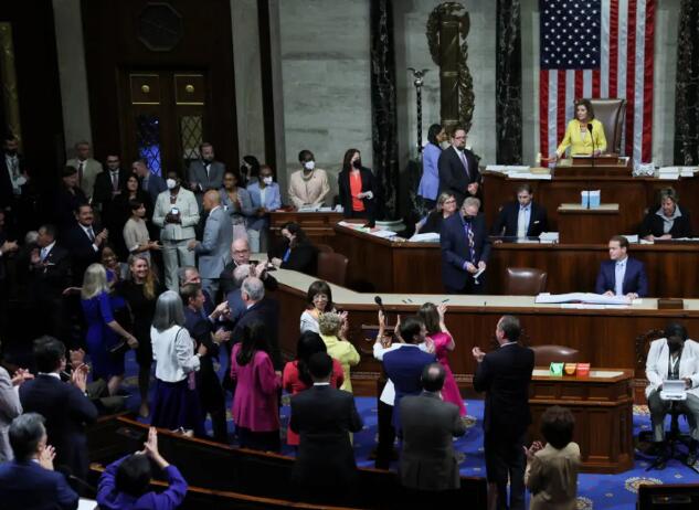 美眾議院通過《反通脹法案》現(xiàn)場。注意星條旗左側(cè)纏繞月桂葉的法西斯標志浮雕