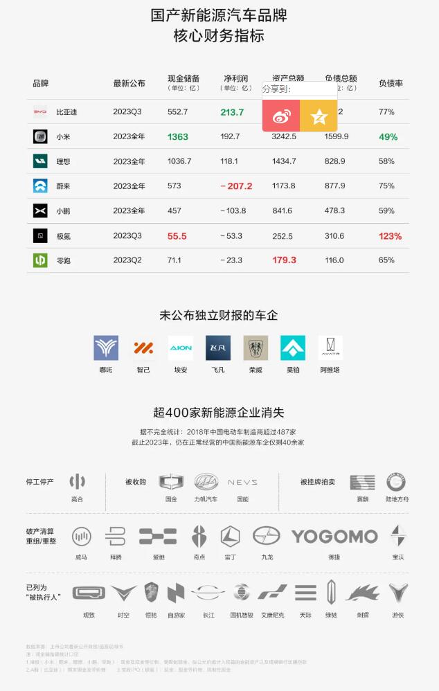 新進(jìn)入場(chǎng)的小米堪稱科技富二代,根據(jù)剛剛披露的2023年財(cái)報(bào),1363億元現(xiàn)金儲(chǔ)備不僅領(lǐng)銜國產(chǎn)新能源,更創(chuàng)下其自身的歷史新高。緊隨其后的是理想和比亞迪,值得一提的是,目前比亞迪、理想、小米是為數(shù)不多實(shí)現(xiàn)集團(tuán)盈利的新能源品牌。其他品牌仍然難以逾越賠錢造車的紅線。