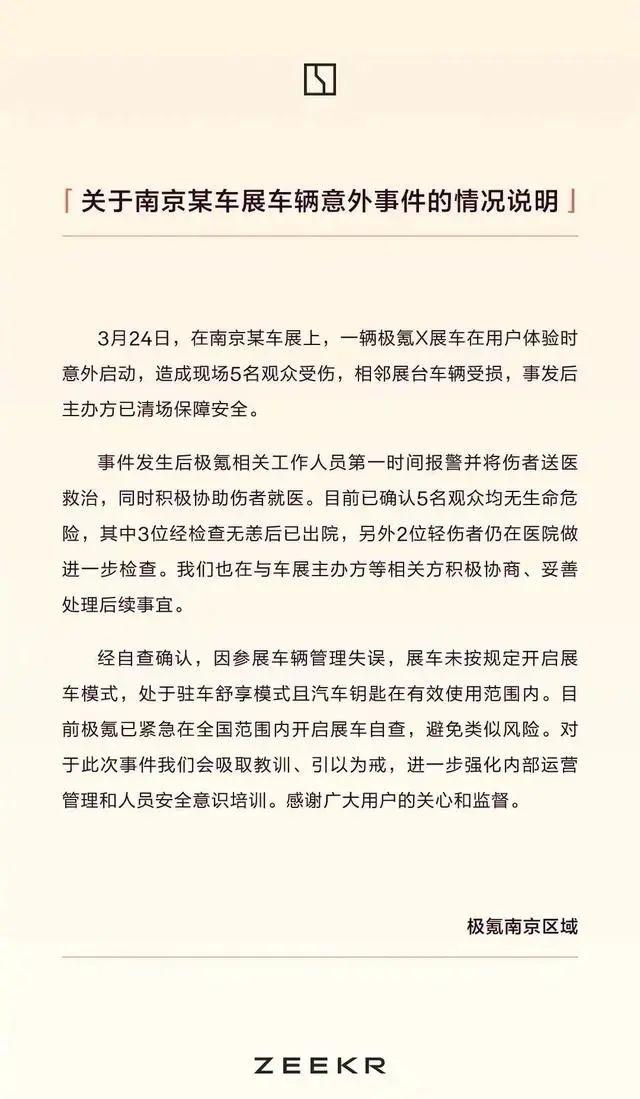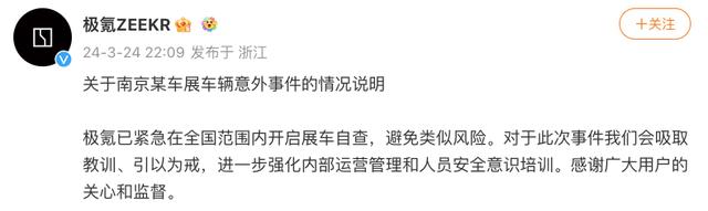針對(duì)此次意外事件,極氪官方微博@極氪ZEEKR 于3月24日22時(shí)09分發(fā)布《關(guān)于南京某車展車輛意外事件的情況說(shuō)明》。