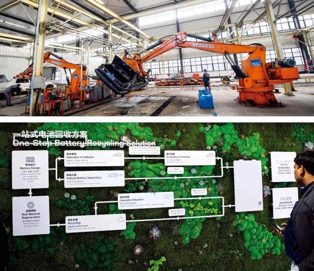 下圖:2023年4月,在上海車展期間,寧德時代展示的一站式電池回收方案。圖/視覺中國