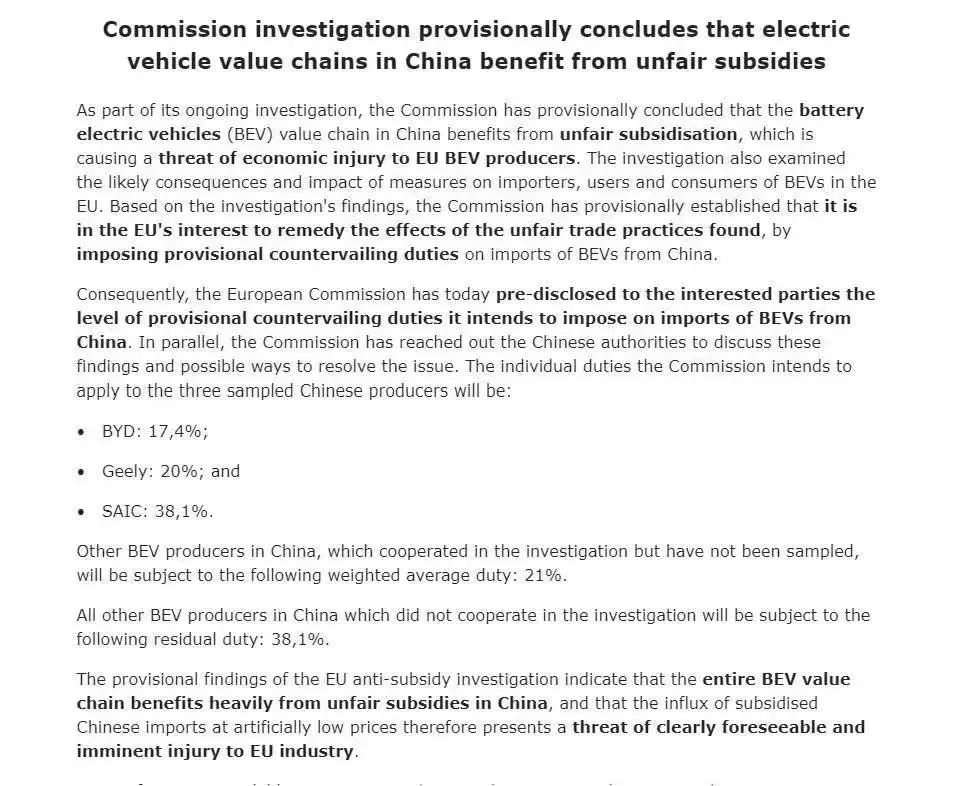 6月12日,歐盟委員會(huì)發(fā)布公告稱(chēng),如無(wú)法與中方達(dá)成解決方案,針對(duì)從中國(guó)進(jìn)口的電動(dòng)汽車(chē)征收臨時(shí)反補(bǔ)貼稅的方案將于7月4日起實(shí)施。歐盟委員會(huì)表示,對(duì)抽樣的三家企業(yè)——比亞迪、吉利汽車(chē)和上汽集團(tuán),將分別加征17.4%、20%和38.1%的反補(bǔ)貼稅;對(duì)參與調(diào)查但未被抽樣的電動(dòng)汽車(chē)制造商平均加征21%的反補(bǔ)貼稅;未配合調(diào)查的電動(dòng)汽車(chē)制造商將被加征38.1%的反補(bǔ)貼稅。