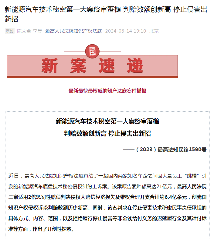 北京歷時6年,吉利起訴威馬竊取商業(yè)機(jī)密和技術(shù)侵權(quán)案件近日終審落槌。據(jù)最高人民法院知識產(chǎn)權(quán)法庭發(fā)布的《(2023)最高法知民終1590號新能源汽車底盤技術(shù)秘密侵權(quán)案民事判決書》顯示,原告吉利方勝訴,威馬方敗訴需賠償吉利方6.4億余元,創(chuàng)我國知識產(chǎn)權(quán)侵權(quán)訴訟判賠數(shù)額歷史新高。
