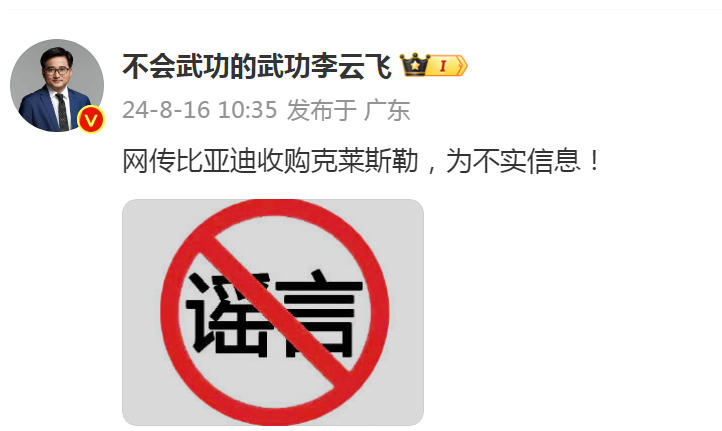 來源:比亞迪品牌與公關(guān)事業(yè)部總經(jīng)理李云飛微博、上海證券報(bào)微信