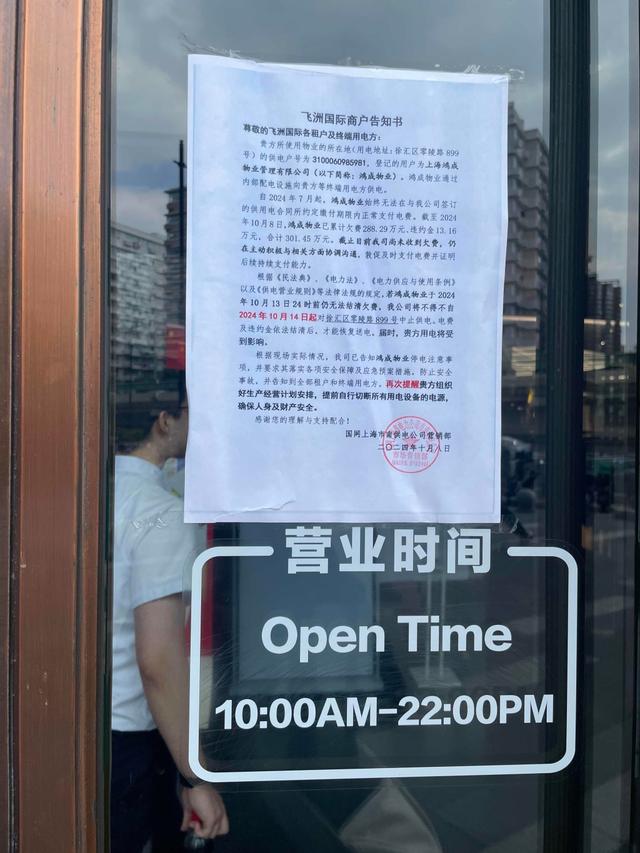 不過(guò),在該商場(chǎng)門(mén)口、電梯口等多處地方都貼上了告示,上面寫(xiě)著:自2024年7月起,鴻成物業(yè)無(wú)法在供電合同所約定繳付期限內(nèi)正常支付電費(fèi)。截至2024年10月8日,鴻成物業(yè)已累計(jì)欠費(fèi)288.29萬(wàn)元、違約金13.16萬(wàn)元,合計(jì)301.45萬(wàn)元。若鴻成物業(yè)于2024年10月13日24時(shí)前仍無(wú)法結(jié)清欠費(fèi),國(guó)網(wǎng)上海市南供電公司不得不自2024年10月14日起,對(duì)零陵路899號(hào)中止供電。