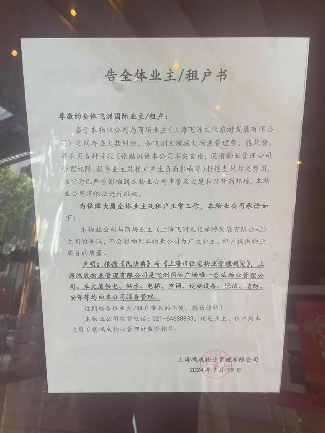 值得注意的是,鴻成物業(yè)與飛洲文旅此前已經(jīng)存在經(jīng)濟(jì)糾紛。記者辦公樓下看到,鴻成物業(yè)7月19日發(fā)布了一份“告全體業(yè)主/租戶(hù)書(shū)”,上面寫(xiě)著,鴻成物業(yè)與飛洲文旅之間存在欠款糾紛,如飛洲文旅拖欠物業(yè)費(fèi)、能耗費(fèi),并拒絕支付相關(guān)費(fèi)用,鴻成物業(yè)將進(jìn)行依法維權(quán)。