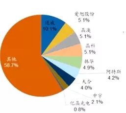 就中游的行業(yè)格局來看,2019年光伏電池產量全球市占率前五的分別為通威,愛旭股份,晶澳,晶科和華韓。其中通威是連續(xù)三年成為全球產能及出貨量第一的獨立第三方電池企業(yè)。但其CR5市占率不足30%,競爭較為激烈。