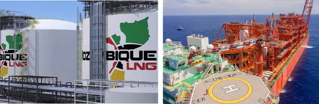 停產(chǎn)的莫桑比克LNG陸地工廠項目(左圖)與成功投產(chǎn)的莫桑比克FLNG項目(右圖)