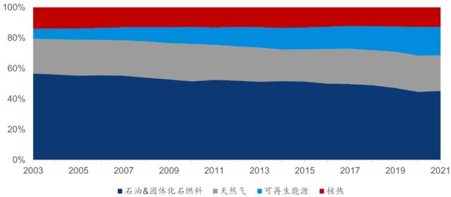 以歐美地區(qū)為代表,天然氣已經(jīng)成為眾多歐美國家的重要支柱能源。在歐盟27國中,天然氣作為直接燃料或發(fā)電能源,提供了該地區(qū)45%的化工能源需求、40%的鋼鐵能源需求、55%的食品飲料能源需求和40%的建筑能源需求。歐洲在過去二十年致力于推動清潔能源的利用,將可再生能源的占比從7%提升至了19%,但主要取代的是煤炭和石油的份額,絲毫沒有動搖天然氣在歐洲地區(qū)的重要地位,天然氣在所有能源中穩(wěn)定占據(jù)約23%的份額。