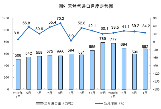 天然氣進(jìn)口連續(xù)7個月保持30%以上的高速增長。4月份,天然氣進(jìn)口682萬噸,同比增長34.2%,增速比上月回落5個百分點(diǎn)。1-4月份,進(jìn)口天然氣2742萬噸,同比增長36.4%。