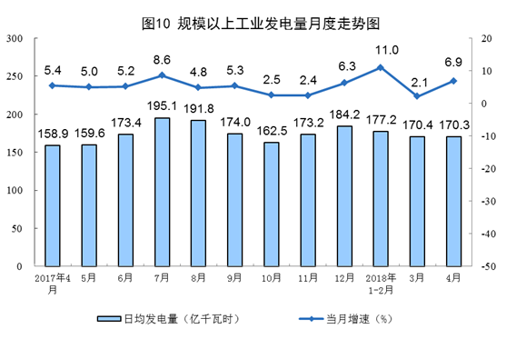 4月份,受用電需求增加影響,電力生產(chǎn)明顯加快,發(fā)電量5107.8億千瓦時,同比增長6.9%,增速比上月加快4.8個百分點(diǎn)。1-4月份,發(fā)電量同比增長7.7%,增速較1-3月份回落0.3個百分點(diǎn)。