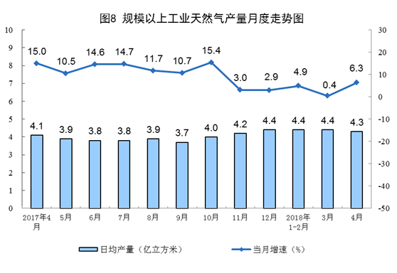 4月份,天然氣生產(chǎn)保持高位,產(chǎn)量128.9億立方米,同比增長6.3%,增速比上月加快5.9個百分點(diǎn);日均生產(chǎn)4.3億立方米,比上月減少0.1億立方米。