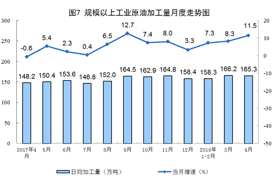 受去年同期大型石化企業(yè)停產(chǎn)檢修較多,以及今年原油進(jìn)口配額和成品油出口配額均大幅增加等多重因素影響,原油加工量增長較快。4月份,原油加工量4958萬噸,同比增長11.5%,比上月加快3.2個百分點(diǎn);日均加工165.3萬噸,比上月減少0.9萬噸。