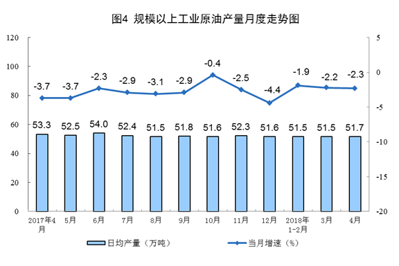 4月份,原油生產(chǎn)1551萬噸,同比下降2.3%,降幅比上月擴(kuò)大0.1個百分點(diǎn);日均產(chǎn)量51.7萬噸,比上月增加0.2萬噸。