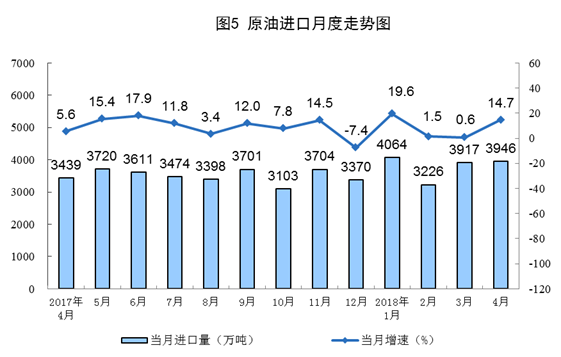 4月份,原油進(jìn)口大幅增長,進(jìn)口3946萬噸,同比增長14.7%,增速比上月加快14.1個百分點(diǎn);日均進(jìn)口131.5萬噸,再創(chuàng)歷史新高。1-4月份,進(jìn)口原油1.5億噸,同比增長8.9%。