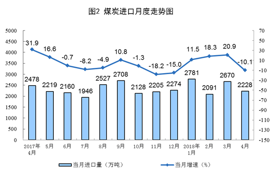 煤炭進(jìn)口大幅下降。4月份,進(jìn)口煤炭2228萬噸,同比下降10.1%。1-4月份,進(jìn)口煤炭9768萬噸,同比增長9.3%。