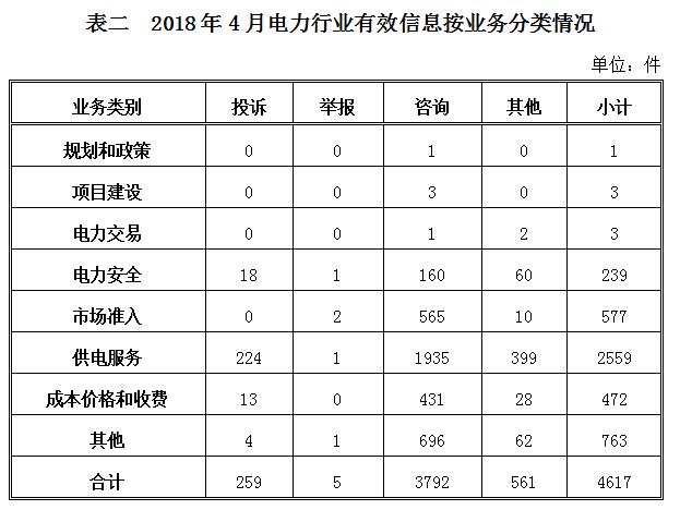投訴舉報主要集中在電力行業(yè),共264件。從業(yè)務(wù)分類情況看,電力安全方面19件,占7.20%;市場準入方面2件,占0.76%;供電服務(wù)方面225件,占85.23%;成本價格和收費方面13件,占4.92%;其他方面5件,占1.89%。(2018年4月電力行業(yè)有效信息按業(yè)務(wù)分類情況見表二)