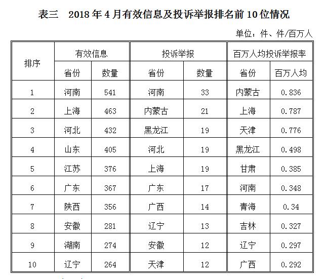 2018年4月,各?。ㄗ灾螀^(qū)、直轄市)按照有效信息數(shù)量排序,河南、上海、河北等?。ㄊ校┝腥珖?0位;按照投訴舉報數(shù)量排序,河南、內(nèi)蒙古、黑龍江等?。ㄗ灾螀^(qū))排在全國前10位;按照百萬人均投訴舉報率排序,內(nèi)蒙古、上海、天津等省(市、自治區(qū))位于全國前10位。(2018年4月有效信息及投訴舉報排名前10位情況見表三)