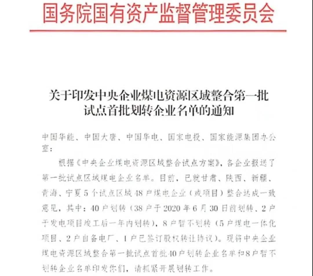 中國電力網(wǎng)訊 5月20日,國資委向五大發(fā)電集團下發(fā)了《關(guān)于印發(fā)中央企業(yè)煤電資源區(qū)域整合第一批試點首批劃轉(zhuǎn)企業(yè)名單的通知》(下稱《通知》)。中國華能、中國大唐、中國華電、國家電投、國家能源集團根據(jù)《中央企業(yè)煤電資源區(qū)域整合試點方案》,將在甘肅、陜西、新疆、青海、寧夏5個試點區(qū)域開展第一批試點。第一批試點共涉及48戶煤電企業(yè)(或項目),其中,38戶將于2020年6月30日前劃轉(zhuǎn)、2戶于發(fā)電項目竣工后一年內(nèi)劃轉(zhuǎn)、8戶暫不劃轉(zhuǎn)(5戶煤電一體化項目、2戶自備電廠、1戶已簽訂股權(quán)轉(zhuǎn)讓協(xié)議)。