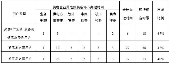 2. 對于居民用戶和實行“三零”服務的低壓非居民用戶,用電報裝壓減為受理簽約、施工接電2個環(huán)節(jié),在工作目標中已規(guī)定全過程辦理時間。