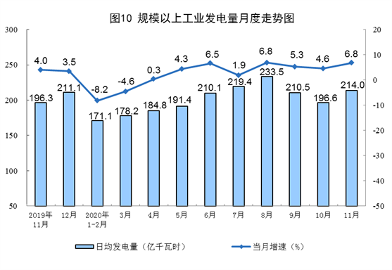 電力生產明顯加快。11月份,發(fā)電量6419億千瓦時,同比增長6.8%,增速比上月加快2.2個百分點;日均發(fā)電214.0億千瓦時,環(huán)比增加17.4億千瓦時。1—11月份,發(fā)電量66824億千瓦時,同比增長2.0%。
