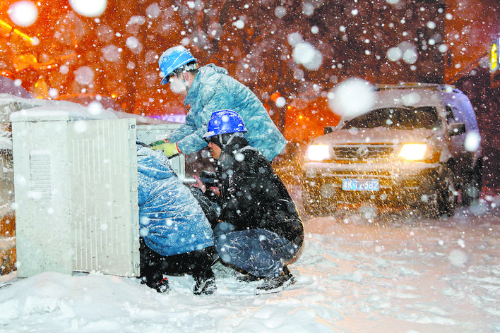 圖④ 1月6日,山東威海供電公司員工在花園南路小區(qū)搶修,快速恢復(fù)客戶供電。劉中華 攝