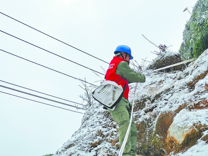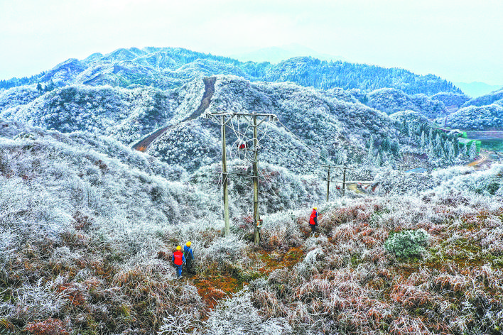 圖① 1月6日,國家電網(wǎng)湖南電力共產(chǎn)黨員服務(wù)隊在雪峰山觀冰站巡檢線路。 胡浩 攝