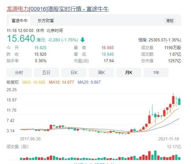 龍源電力(港股代碼00916),從2020年6月開始啟動,乘著市場猛炒新能源賽道東風,到目前已經漲幅巨大,達到5倍。
