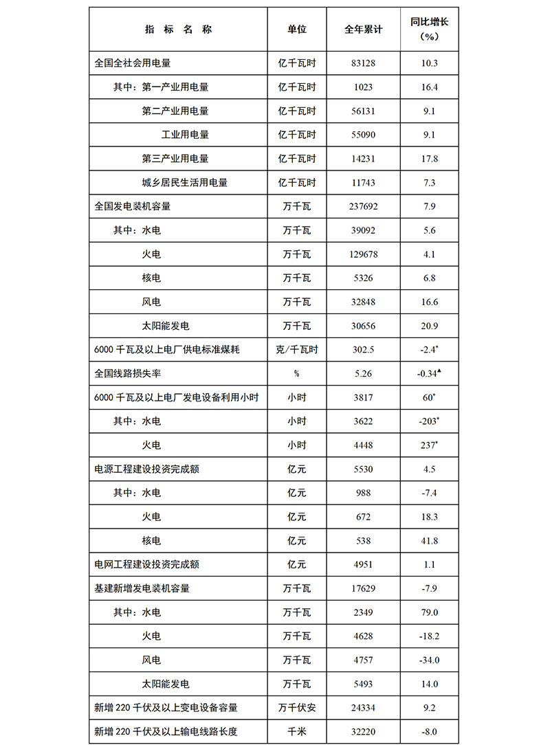 注:1.全社會用電量為全口徑數(shù)據(jù),全國供電量為調(diào)度口徑數(shù)據(jù)。2.“同比增長”列中,標(biāo)*的指標(biāo)為絕對量;標(biāo)▲的指標(biāo)為百分點(diǎn)。