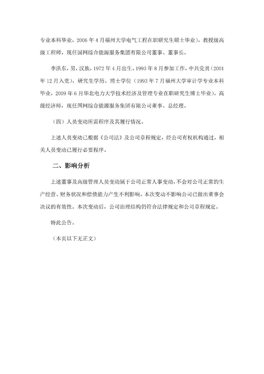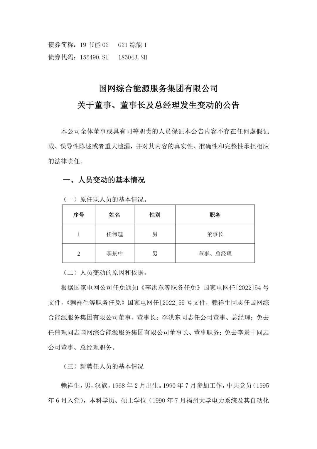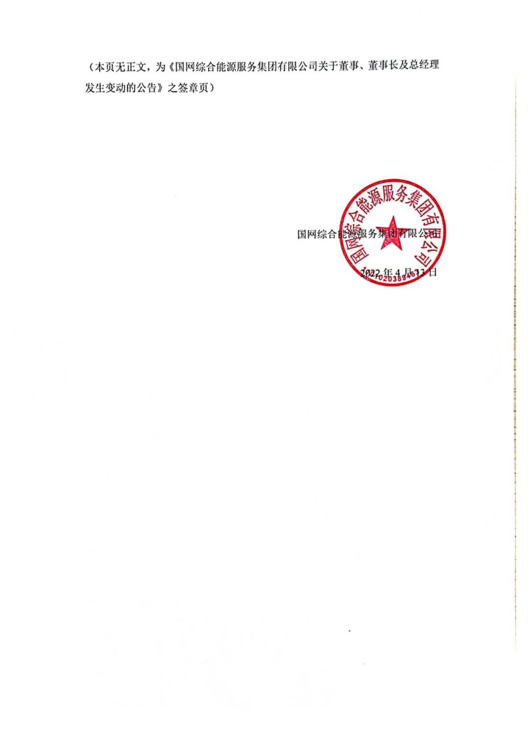 本網(wǎng)訊 4月13日,國(guó)網(wǎng)綜合能源服務(wù)集團(tuán)有限公司發(fā)布關(guān)于董事、董事長(zhǎng)及總經(jīng)理發(fā)生變動(dòng)的公告。公告顯示,賴(lài)祥生同志任國(guó)網(wǎng)綜合能源服務(wù)集團(tuán)有限公司董事、董事長(zhǎng);李洪東同志任公司董事、總經(jīng)理;免去任偉理同志國(guó)網(wǎng)綜合能源服務(wù)集團(tuán)有限公司董事長(zhǎng)、董事職務(wù);免去李景中同志公司董事、總經(jīng)理職務(wù)。