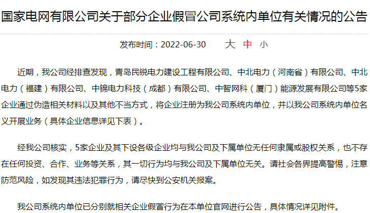 本網(wǎng)訊  6月30日,國(guó)家電網(wǎng)官網(wǎng)發(fā)布“國(guó)家電網(wǎng)有限公司關(guān)于部分企業(yè)假冒公司系統(tǒng)內(nèi)單位有關(guān)情況的公告”。