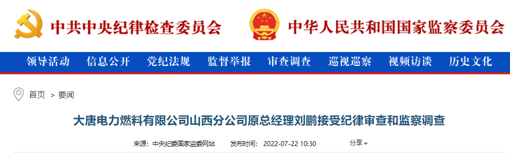 中央紀(jì)委國家監(jiān)委網(wǎng)站7月22日消息,據(jù)中國大唐集團(tuán)有限公司紀(jì)檢監(jiān)察組、山西省監(jiān)察委員會(huì)消息:大唐電力燃料有限公司山西分公司原總經(jīng)理劉鵬涉嫌嚴(yán)重違紀(jì)違法,目前正接受中國大唐集團(tuán)有限公司紀(jì)檢監(jiān)察組紀(jì)律審查和山西省太原市監(jiān)察委員會(huì)監(jiān)察調(diào)查。