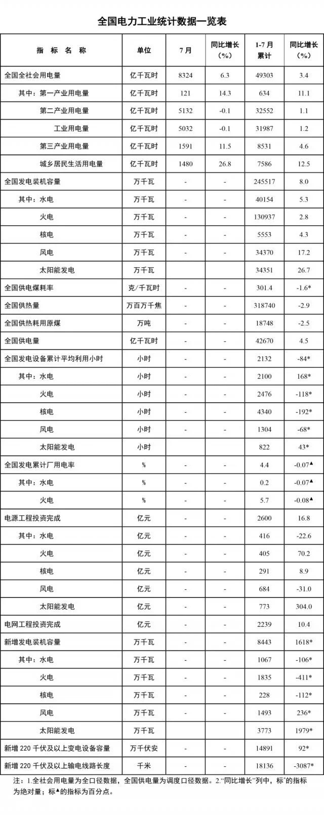本網(wǎng)訊 8月19日,國家能源局發(fā)布1-7月份全國電力工業(yè)統(tǒng)計數(shù)據(jù)。截至7月底,全國發(fā)電裝機容量約24.6億千瓦,同比增長8.0%。其中,風(fēng)電裝機容量約3.4億千瓦,同比增長17.2%;太陽能發(fā)電裝機容量約3.4億千瓦,同比增長26.7%。