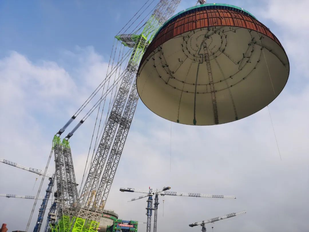 內(nèi)穹頂?shù)跹b是華龍一號核電工程建設(shè)的重要里程碑。穹頂位于核島頂部,主要功能是保證反應(yīng)堆廠房完整性和密封性,對放射性包容起關(guān)鍵性作用。吊裝當(dāng)天,隨著總指揮一聲令下,內(nèi)穹頂被緩緩吊離地面,經(jīng)過起鉤、變幅、提升、帶載行走、大臂逆時(shí)針回轉(zhuǎn)等一系列高精度動作,精準(zhǔn)直達(dá)漳州核電2號機(jī)組反應(yīng)堆廠房上方,隨后緩慢下降,經(jīng)調(diào)整無誤后,平穩(wěn)落鉤就位在安全殼鋼襯里上。