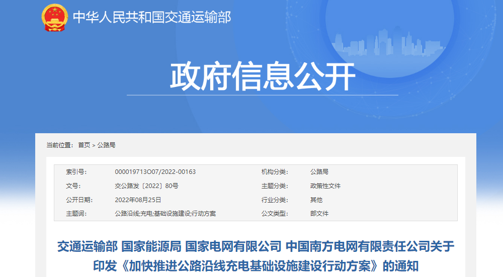 交通運(yùn)輸部 國家能源局 國家電網(wǎng)有限公司 中國南方電網(wǎng)有限責(zé)任公司關(guān)于印發(fā)《加快推進(jìn)公路沿線充電基礎(chǔ)設(shè)施建設(shè)行動(dòng)方案》的通知