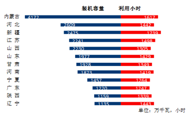 圖3 1-8月份風(fēng)電裝機(jī)較多省份風(fēng)電裝機(jī)容量和設(shè)備利用小時