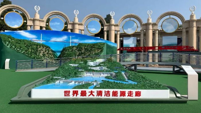 沙盤模型展示了長江干流烏東德、白鶴灘、溪洛渡、向家壩、三峽、葛洲壩6座梯級水電站樞紐建筑物及配套設(shè)施,逼真再現(xiàn)了由這6座梯級電站構(gòu)成的世界最大清潔能源走廊的恢弘氣勢與格局,向觀眾呈現(xiàn)了新中國水電事業(yè)從自立更生、創(chuàng)新發(fā)展到領(lǐng)跑世界的奮斗歷程,并融入新能源和長江大保護等元素,展示了三峽集團奮力實施清潔能源和長江生態(tài)環(huán)保“兩翼齊飛”發(fā)展愿景。