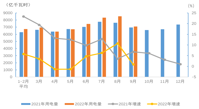 圖1 2021、2022年分月全社會用電量及其增速