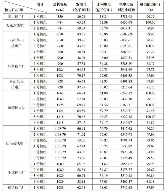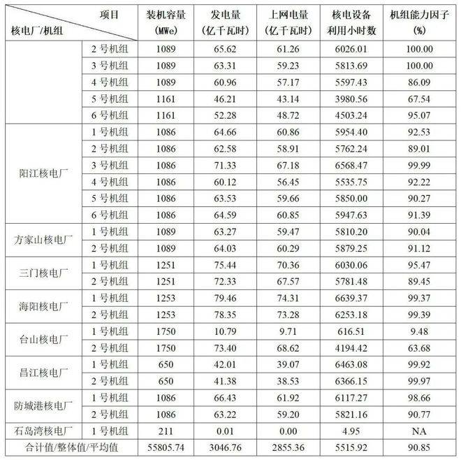 3)本表“合計值/整體值/平均值”中,裝機容量、發(fā)電量、上網(wǎng)電量為各機組合計值,核電設備利用小時數(shù)為全部機組整體值,機組能力因子為全部機組的算數(shù)平均值。