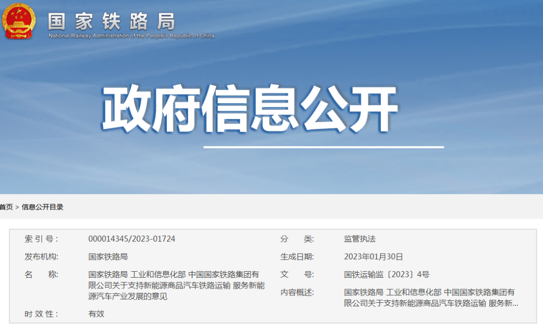 國家鐵路局 工業(yè)和信息化部 中國國家鐵路集團有限公司關(guān)于支持新能源商品汽車鐵路運輸 服務(wù)新能源汽車產(chǎn)業(yè)發(fā)展的意見