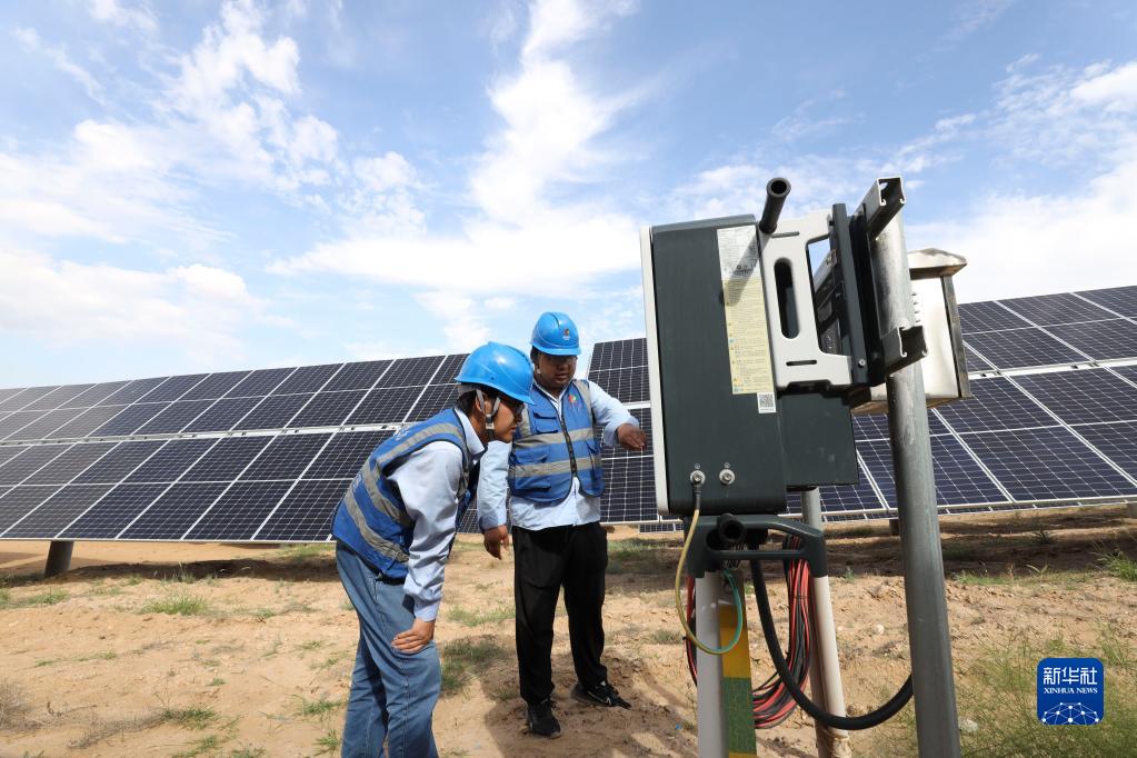 國家電投五凌電力余丁光伏電站職工在檢修設(shè)備(2022年8月31日攝)。